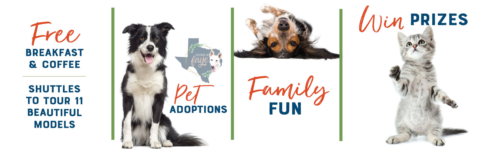Tour 11 model homes on Saturday, November 13th at The Lake House in Grand Central Park while supporting Friends of Faye! Come for pet adoptions, family-fun, pet vendors including PetBar, Twyla’s Friends Rescue & Bubba's Biscuits, and free breakfast and coffee.
