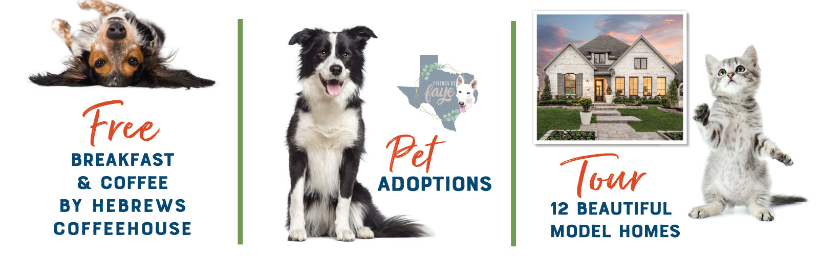 Friends of Faye will showcase “Pet-Ential” furry friends for adoption, and we will cover the adoption fee! The event also includes free coffee & pastries by Hebrews Coffeehouse, pet vendors and the opportunity to tour 12 model homes. Admission is free.
