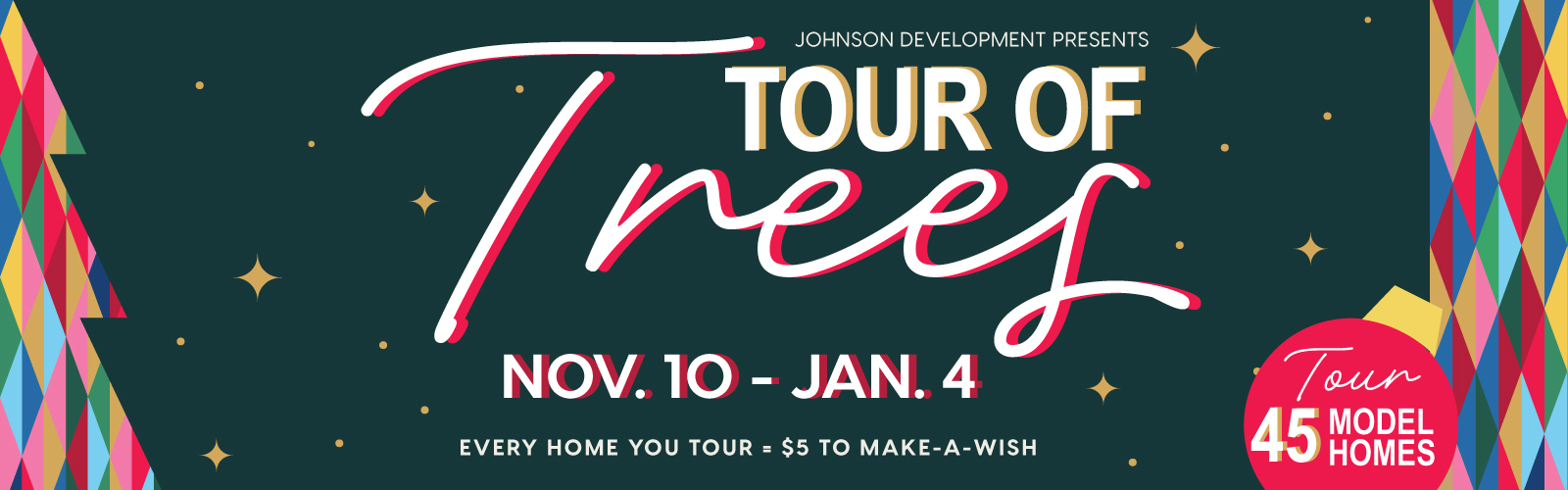 Wander through 45 beautifully adorned model homes, each sparkling with a uniquely themed Christmas tree. Every time you visit a model home and scan its QR code, we’ll donate $5 to Make-A-Wish Foundation on your behalf. The more homes you explore, the more money is donated, at no cost to you. Help us make a wish come true this holiday season!